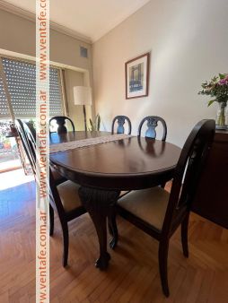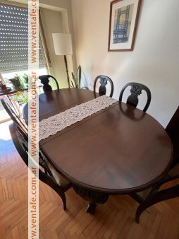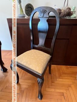 Juego de comedor estilo chippendale compuesto de: mesa de 6 patas, armada completa llega a 2,20 m. x 1,10 m. Tiene dos paños intermedios de 0,39 m. que pueden retirarse fácilmente para achicarla. Va con 6 sillas tapizadas en tono amarillo. Muy buen estado tanto la mesa como las sillas. Ideal para intervenir a gusto .