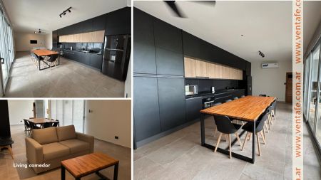 -Cocina comedor amplio equipada con vajilla completa, mesa, sillas, sillón, heladera, cafetera, pava eléctrica, microondas, horno y anafe eléctrico.