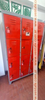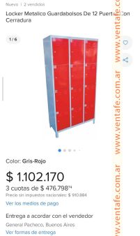 Lockers de 12 casilleros con sus respectivas cerraduras y llaves. Estado muy bueno de chapa color roja en uso actualmente en un local de calle salta y 1 de mayo. Precio charlable